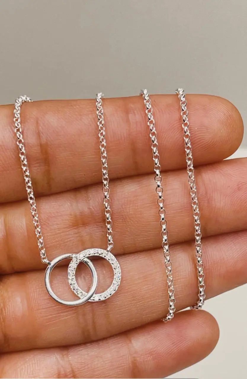 Cadena mini rolo con dije doble círculo – Plata 925Cadena mini rolo en plata 925, con dije de doble círculo entrelazado. Regulable de 40 a 45 cm. Sutil, moderna y simbólica.